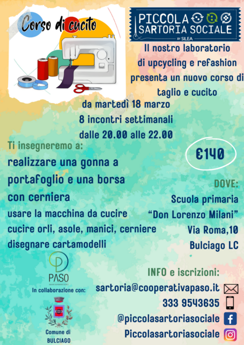 Stanno per ripartire i corsi di cucito proposti dalla Piccola Sartoria Sociale della Cooperativa Paso sul territorio lecchese. Questa volta si potrà imparare a realizzare una gonna a portafoglio ed una borsa con cerniera, oltre che ad utilizzare la macchina da cucito per orli, asole, manici e cerniere. Il tutto partendo dal disegno su cartamodello