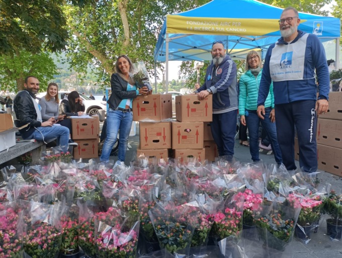 Anche in piazza Cermenati i volontari Airc sono presenti per la vendita delle azalee in favore della ricerca; al banchetto anche due ricercatori che giornalmente sono impegnati in questa importantissima missione.