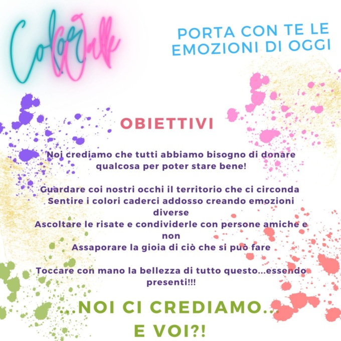 “Noi crediamo che tutti abbiamo bisogno di donare qualcosa per poter stare bene! – hanno spiegato gli organizzatori elencando gli obiettivi – Guardare coi nostri occhi il territorio che ci circonda e sentire i colori caderci addosso creando emozioni diverse. Ascoltare le risate e condividerle con persone amiche e non, assaporare la gioia di ciò che si può fare, toccare con mano la bellezza di tutto questo…essendo presenti!!! Noi ci crediamo, e voi?”