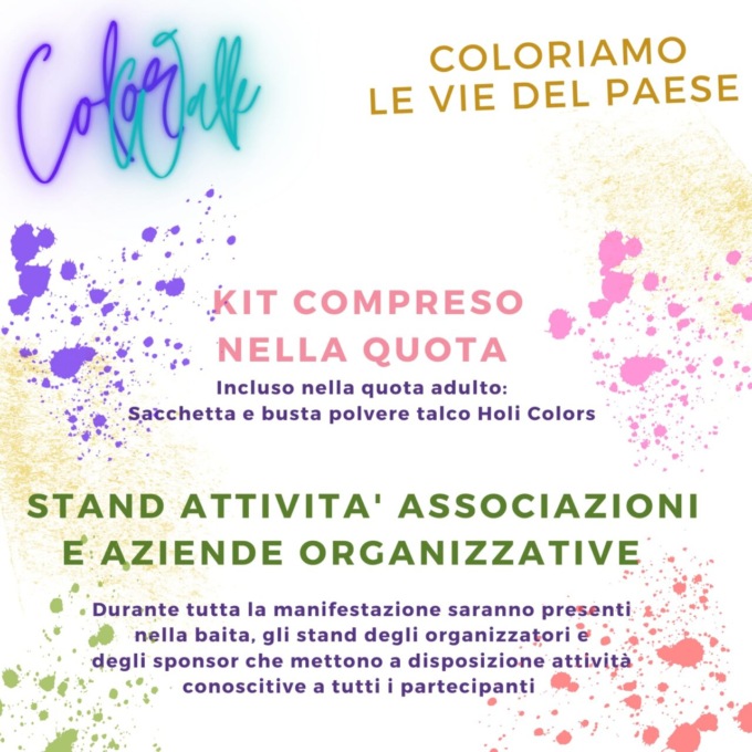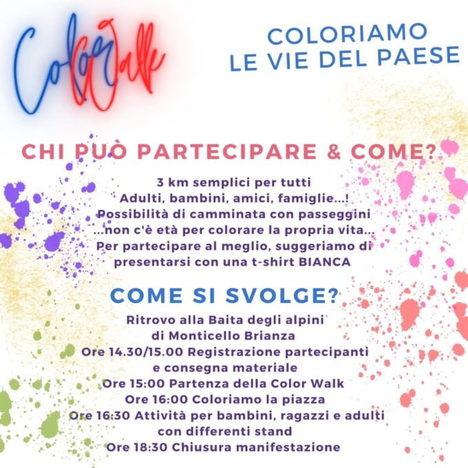 La giornata parte con il ritrovo alla Baita degli alpini di Monticello Brianza. Tra le 14.30 alle 15 sarà possibile accedere alla registrazione dei partecipanti e la consegna materiale. Alle 15 la partenza della Color Walk e alle 16:00 il momento del “Coloriamo la piazza”. Appuntamento alle 16.30 per l’attività per bambini, ragazzi e adulti con differenti stand fino alle 18.30 con il termine e la chiusura della manifestazione.