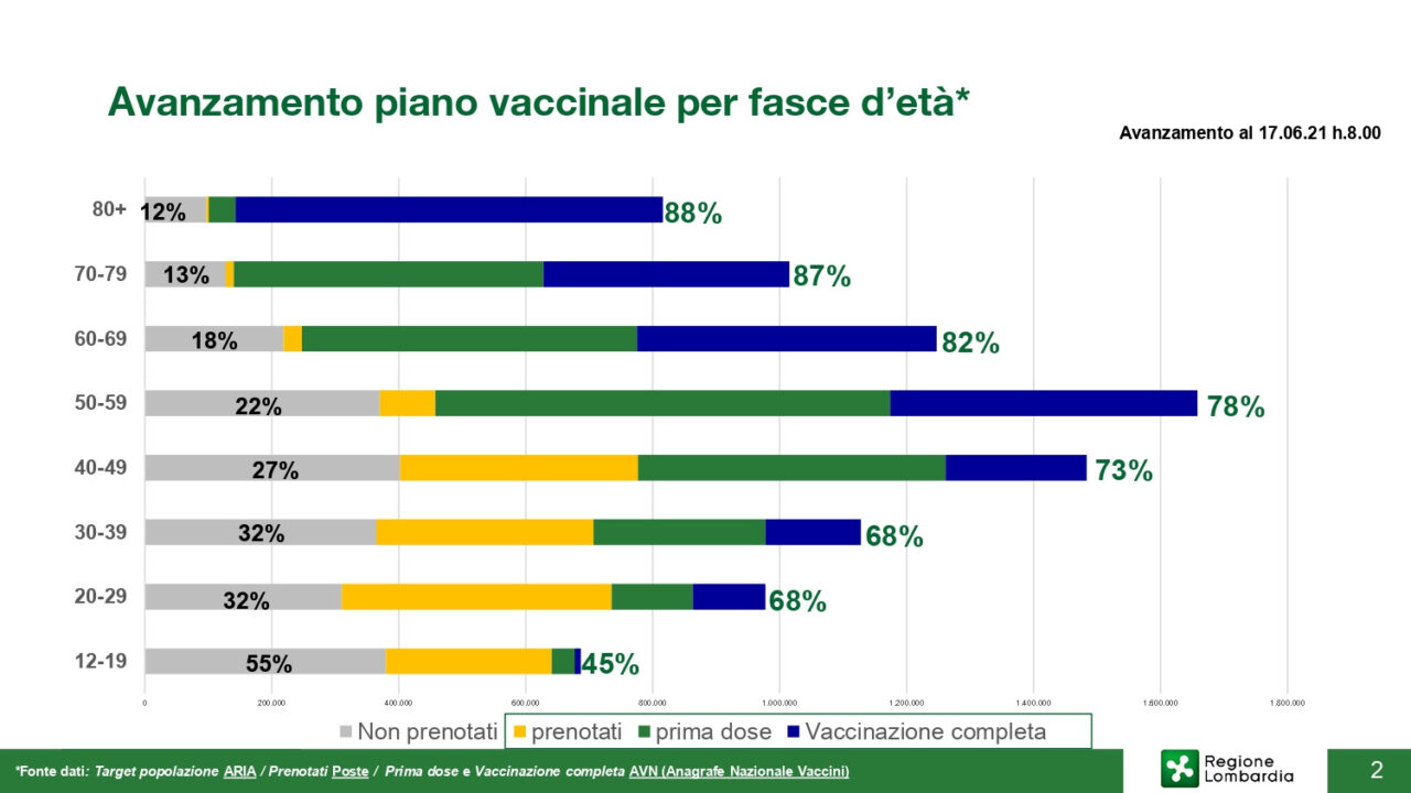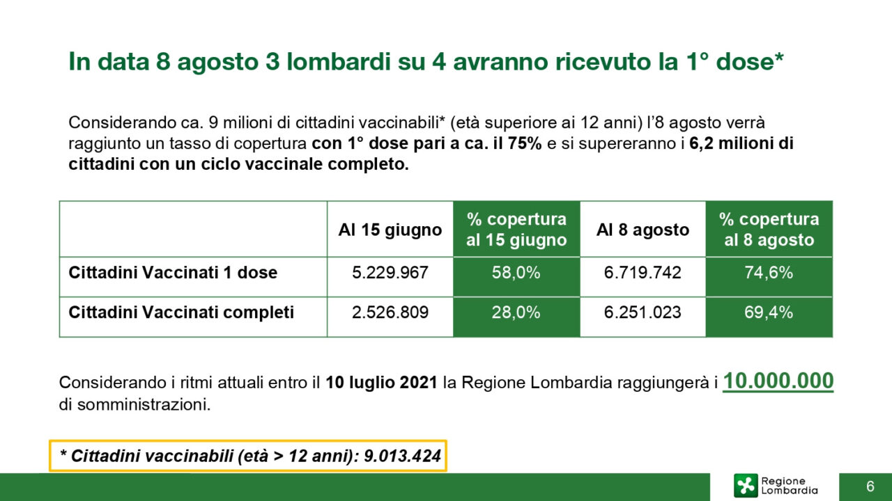 L’8 agosto 3 lombardi su 4 della platea vaccinabile (9.013.424) avranno ricevuto almeno la 1° dose.