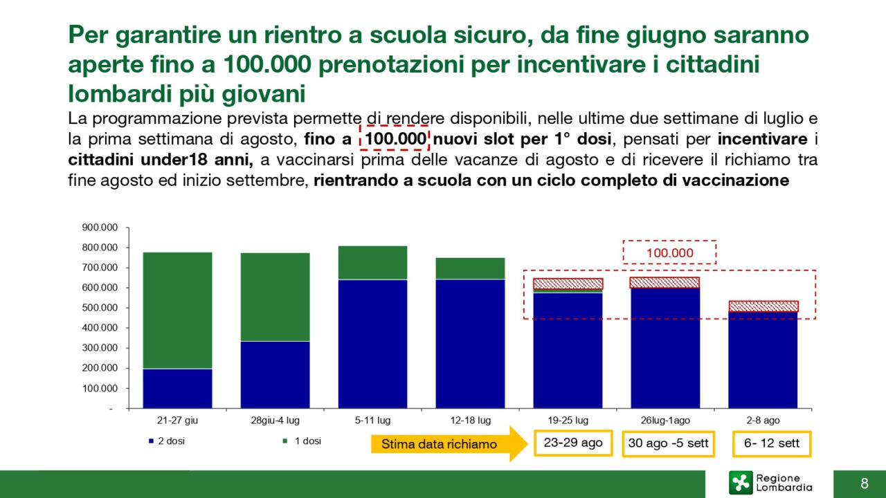 “Per garantire un rientro a scuola sicuro da fine giugno saranno aperte fino a 100.000 prenotazioni per incentivare i cittadini lombardi più giovani a vaccinarsi nelle ultime due settimane di luglio e la prima settimana di agosto. In questo modo potranno andare in vacanza in agosto con una dose e rientrare a scuola a settembre con un ciclo di vaccinazione completo”.