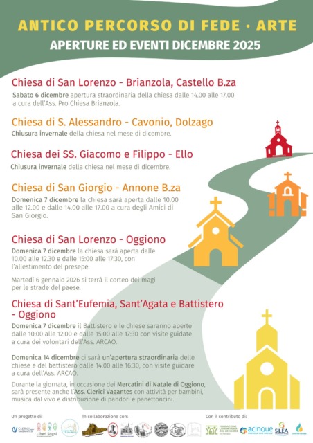 Nel mese di dicembre le chiese di Annone Brianza, Castello Brianza e Oggiono saranno infatti visitabili grazie ai volontari dell’associazione Amici della Chiesa di San Giorgio di Annone, dell’ass. Pro Chiesa di Brianzola di Castello, della Pro Loco e gruppo Arcao di Oggiono.