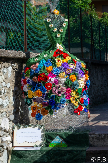 Le opere sono tutte nuove e inedite, rispetto a quanto già visto lo scorso anno realizzate o inviate appositamente per l’edizione 2023. Dove possibile, è anche stato fatto un lavoro di riciclo per salvaguardare e valorizzare la materia prima impiegata e il lavoro svolto, stravolgendo completante l’opera e regalandole una nuova veste. Il recupero – di filati, lavori già fatti, materiali e pezzi in disuso – è stato infatti considerato un forte valore aggiunto.