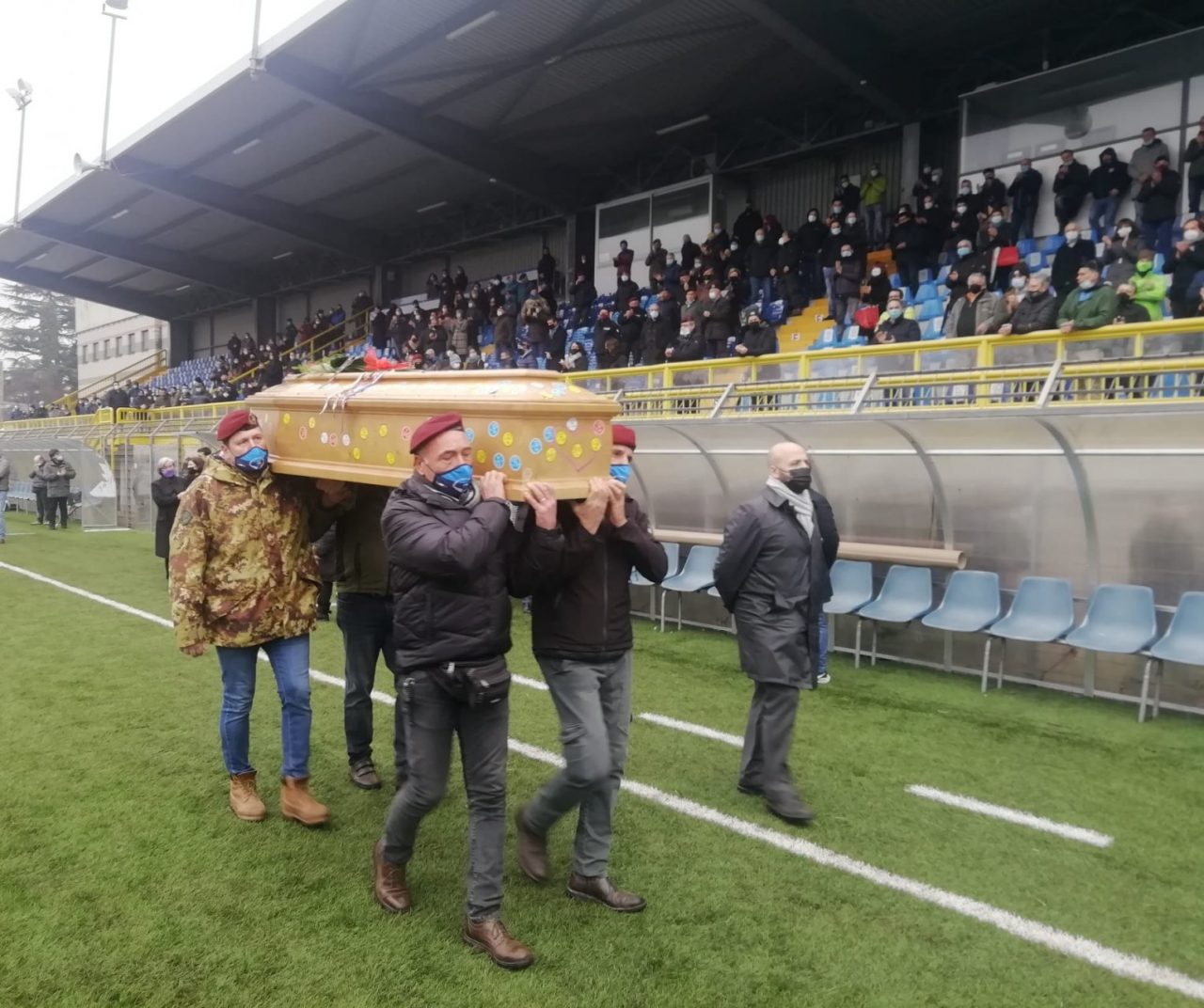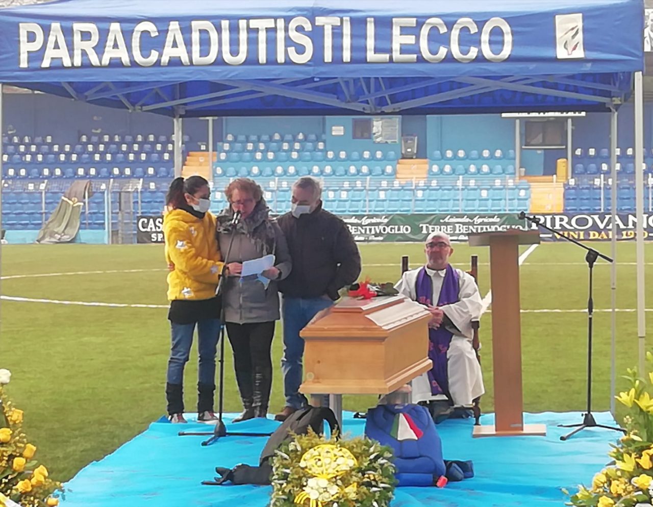 Lo stadio ha accolto i numerosi amici e parenti venuti a salutare per l’ultima volta il paracadutista scomparso troppo presto, a soli 34 anni.