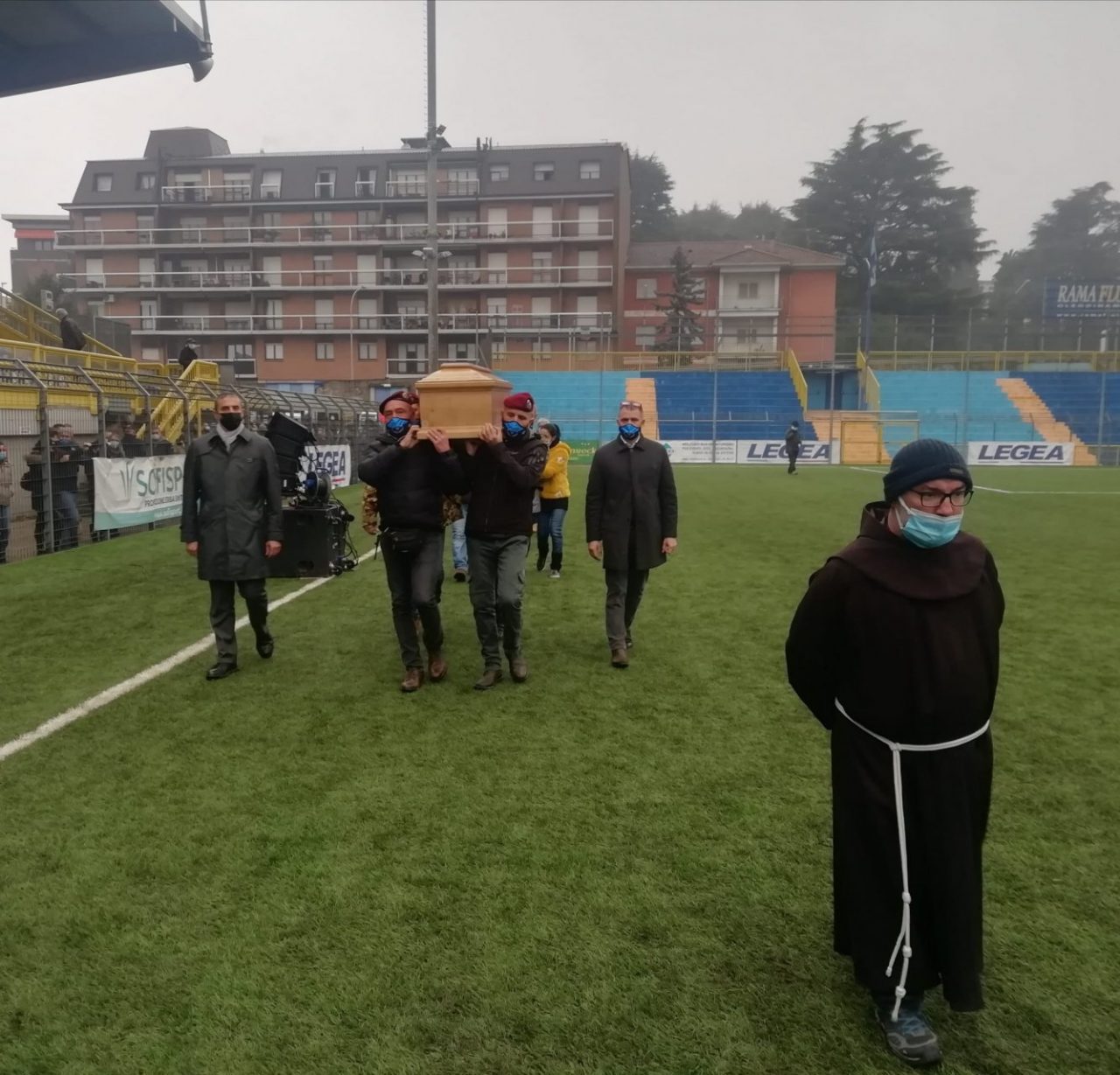 A trasportare il feretro di Marco al di sotto del gazebo montato sopra il prato verde dello stadio sono stati i suoi compagni paracadutisti.