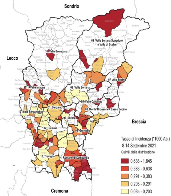 “Il quadro epidemico – sintetizza l’Ats di Bergamo – si mantiene ancora su contenuti livelli di criticità, dovuti anche agli elevati livelli di copertura vaccinale. Nella settimana oggetto di studi si conferma, appunto, un decremento, seppur lento, della curva epidemica, in linea con quello nazionale, ma con valori decisamente più bassi rispetto alla media”.