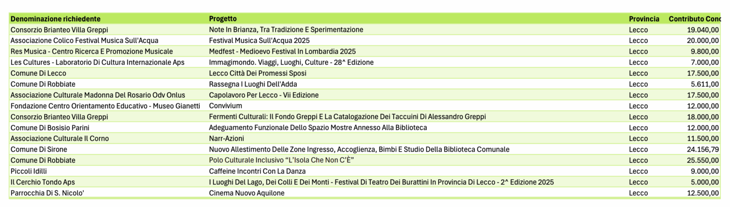 “Sono molto soddisfatto che numerose realtà del territorio lecchese abbiano potuto accedere a questi importanti fondi – dichiara il Sottosegretario alla Presidenza di Regione Lombardia, Mauro Piazza – Voglio ringraziare l’Assessore alla Cultura Francesca Caruso per l’impegno nel mettere a disposizione queste risorse e per il costante supporto alle istituzioni e associazioni impegnate nella promozione culturale. Questi contributi rappresentano una grande opportunità per valorizzare il patrimonio culturale della nostra provincia e per rafforzare l’offerta culturale rivolta a tutta la comunità”.