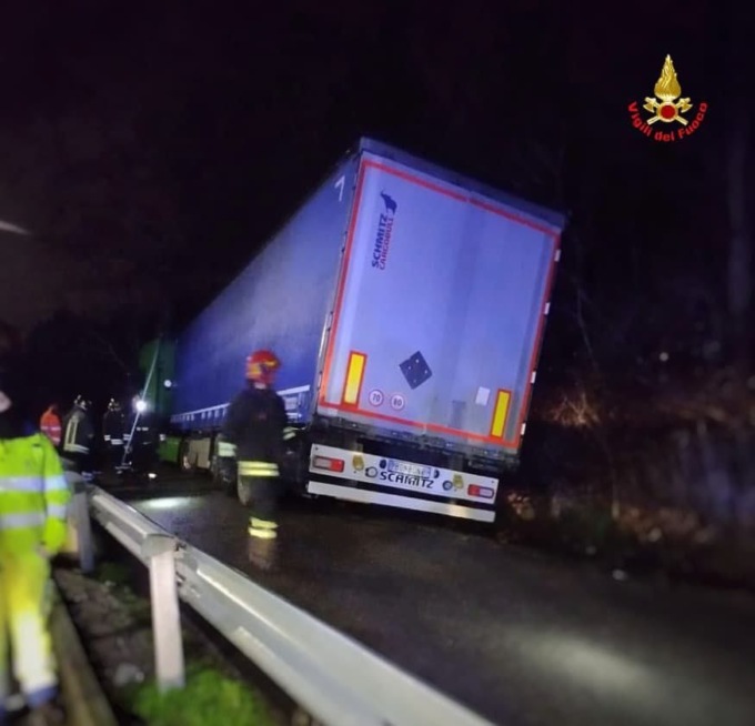 Un autoarticolato, a seguito di un errore di percorso, si è inclinato pericolosamente sul bordo della carreggiata, rendendo necessaria una pronta e coordinata operazione di recupero.