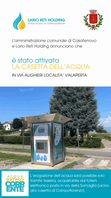 A Casatenovo è possibile usufruire di altre due casette recentemente attivate: la prima nella zona di Campofiorenzo, in via della Somaglia e, dalla scorsa settimana di una seconda anche in centro, in piazza della Repubblica. Tutte le casette, dotate di innovativi sistemi tecnologici che consentiranno la gestione da remoto dell’impianto, erogheranno acqua al costo di euro 0,05 il litro, senza l’uso di contanti e solo tramite l’uso di una tessera dedicata, che potrà essere acquistata e ricaricata presso il totem elettronico posto presso la casetta in via della Somaglia.