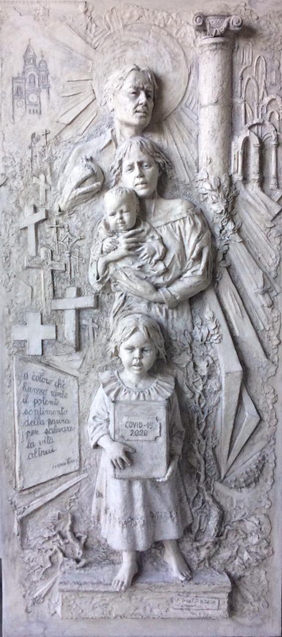 Nella piazza del municipio è stata esposta la scultura dell'artista Franco Travi per ringraziare e ricordare coloro che hanno combattuto contro il Covid.