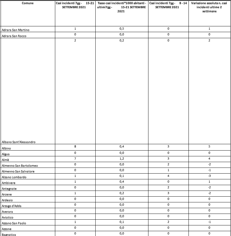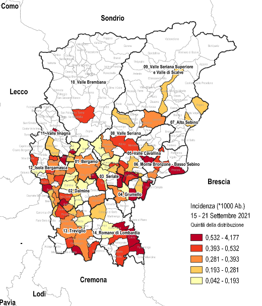 “La dimensione statistica dei nuovi casi su base comunale, ed il relativo tasso di incidenza per 1.000 abitanti, anche per la settimana 15 – 21 settembre 2021 evidenziano una sostanziale stabilità della curva epidemica” . E’ quanto riferisce oggi, mercoledì 22 settembre 2021 Ats Bergamo in merito alla situazione dei contagi Covid in Bergamasca. Rispetto alla scorsa settimana infatti è stato registrato un lievissimo aumento (+12) dei nuovi positivi che l’Agenzia di tutela della salute orobica definisce “statisticamente non significativo”.