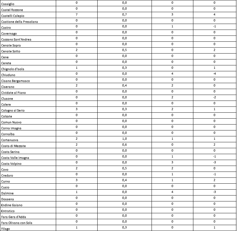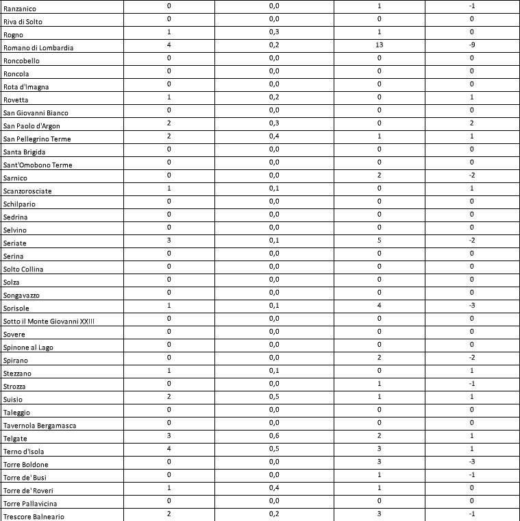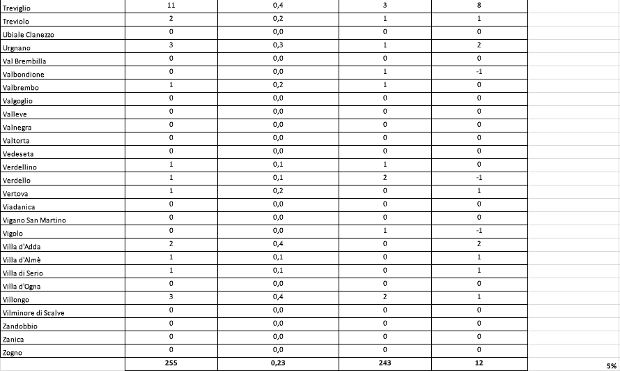 Sale a 153 contro i 149 della scorsa settimana e i 140 di due settimane fa il numero dei Comuni Covid Free. Come sette gironi fa però settimana nessun Ambito Territoriale risulta senza positivi. La zona con incidenza più alta (numero di nuovi casi positivi in rapporto alla popolazione residente) è quella di Grumello del Monte con 30 nuovi casi ogni 100.000 abitanti e quelle con il tasso più basso la Valle Seriana Superiore, la Valle di Scalve e l’Ambito della Valle Brembana rispettivamente con 2 e 5 nuovi casi ogni 100.000 abitanti (23 nuovi casi per 100.000 abitanti in dato provinciale).