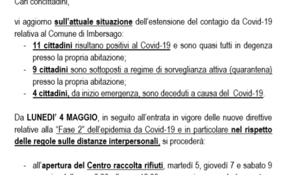 Da lunedì, quando entrerà in vigore il nuovo Dpcm, prenderà il via la “Fase 2” e anche in paese seguiranno alcune riaperture, come ha precisato Vergani. Martedì 5, giovedì 7 e sabato 9 maggio dalle 8.30 alle 12 riaprirà il centro di raccolta rifiuti che nei giorni successivi riprenderà secondo gli orari e le aperture ordinarie. Verrà riaperto anche il cimitero, con l’esclusione dei servizi igenici che resteranno inibiti e i sentieri locali, compresi quelli dell’alzaia dell’Adda. Verrà infine riattivata la casetta dell’acqua di via Mattei.