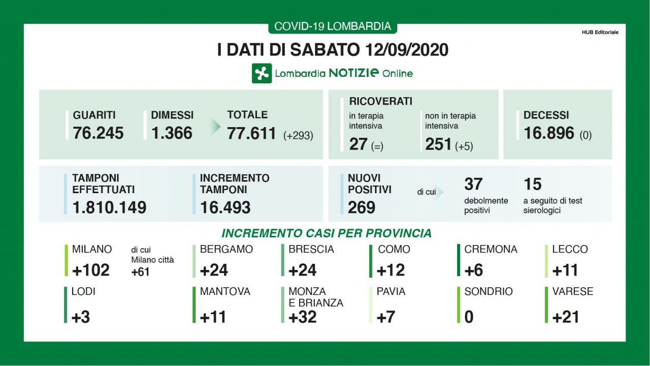 Oggi non è stato registrato alcun decesso e a fronte di 16.493 tamponi effettuati sono 269 i nuovi positivi con un rapporto percentuale dell’1,6%. I guariti e i dimessi sono aumentati di 293 unità. A Sondrio, per il secondo giorno consecutivo, non ci sono stati nuovi casi. I ricoveri in terapia intensiva rimangono stabili (27) mentre i ricoveri ordinari sono aumentati di 5 unità (arrivando a un totale di 251 persone ricoverate).