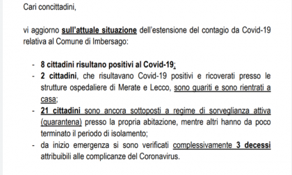 Il sindaco Fabio Vergani ha aggiornato la situazione con i nuovi dati del contagio da Covid19 a Imbersago.