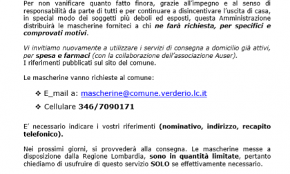 Per poter richiedere le mascherine è necessario inviare una mail all’indirizzo mascherine@comune.verderio.lc.it oppure contattare telefonicamente il numero 3467090171. Sarà anche necessario indicare nominativo, indirizzo e lasciare un numero telefonico. Essendo le mascherine distribuite dalla Regione in numero limitato, l’Amministrazione ha invitato a richiederle solo se strettamente necessarie. La distribuzione avverrà nei prossimi giorni.