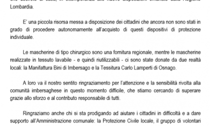 Il primo cittadino ha poi voluto ringraziare anche tutte le realtà che si sono messe a disposizione per aiutare i cittadini in difficoltà e a supportare l’Amministrazione comunale. “Un grazie va alla Protezione civile locale e ai volontari che ogni giorno si occupano di consegnare farmaci e beni di prima necessità agli anziani, ai dipendenti comunali e a chi in autonomia sta assistendo spontaneamente chi ha più bisogno”, ha concluso Vergani augurando agli imbersaghesi una buona pasqua.