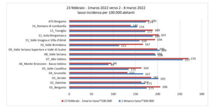 I territori con un’incidenza superiore alla media provinciale sono: Alto Sebino (257 nuovi casi ogni 100 mila abitanti), Val Seriana Superiore e Val di Scalve (204 casi), Seriate (202 casi), Val Seriana (196 casi), Isola Bergamasca (189 casi). Sostanzialmente in linea con la media provinciale, invece, risultano essere Bergamo (175 casi), di Treviglio (172 casi) e Dalmine (171 casi).