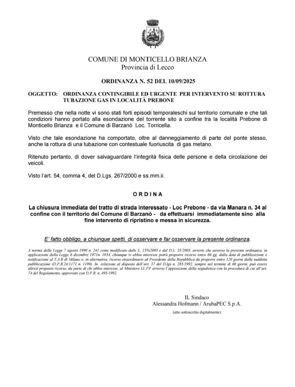 Esonda il torrente e si rompe una tubazione del gas: chiusa una strada. A causa della rottura di una tubazione del gas conseguente all’esondazione del torrente in località Prebone, è stata disposta la chiusura immediata del tratto di strada da via Manara n. 34 al confine con Barzanò (loc. Torricella). A comunicarlo è l’Amministrazione comunale di Monticello Brianza.