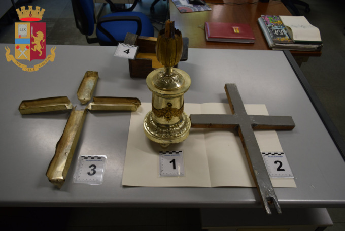 Tra i beni rinvenuti e sequestrati vi erano: una cassetta per le offerte in legno, 3 offertori in metallo, una base per il crocefisso, un crocefisso in legno, una placcatura in ottone del crocefisso.