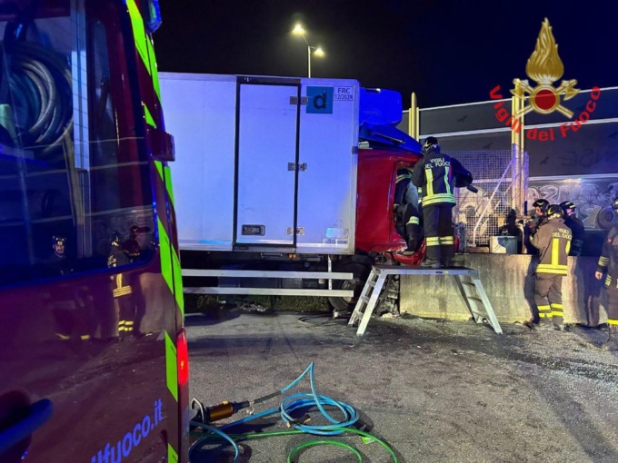 Per cause ancora da accertare l’autista dell’autocarro ha perso il controllo del mezzo schiantandosi direttamente contro il jersey di cemento che delimita la carreggiata.