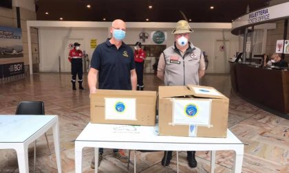 Il presidente del 97° Club Frecce Tricolori di Calusco d'Adda Gianpietro Colleoni insieme al suo vice Antonio Maggioni consegnano le mascherine all'ospedale da campo Ana di Bergamo
