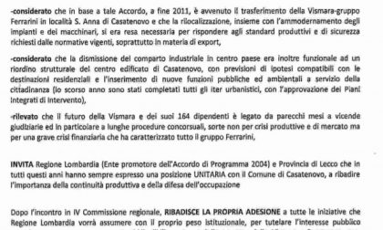 E’ stato il vicesindaco Marta Comi a illustrare il documento presentato questa sera in Consiglio e che vuole coinvolgere con un grande gesto simbolico anche gli enti superiori come Provincia e Regione che per altro hanno anche sottoscritto l’accordo di programma per la riqualificazione del centro del paese, strettamente collegato proprio alle sorti dell’azienda. “Il confronto è nato diversi giorni fa: con questo documento chiediamo una convergenza d’intenti e una collaborazione tra enti per fare in modo che la continuità lavorativa sia sempre una priorità. La stessa ricollocazione dell’azienda aveva come scopo primario il mantenimento di posti di lavoro in Casatenovo, questo era uno dei due pilastri. L’altro era l’ammodernamento dell’azienda” ha affermato la Comi. “Ancora oggi Vismara dà lavoro a 164 persone: abbiamo ricevuto conferma durante questi incontri che le lavorazioni realizzate nello stabilimento di Casatenovo hanno un mercato importante e non accusano una crisi, sono un pilastro fondamentale della produzione di Ferrarini” ha dunque aggiunto il vicesindaco.