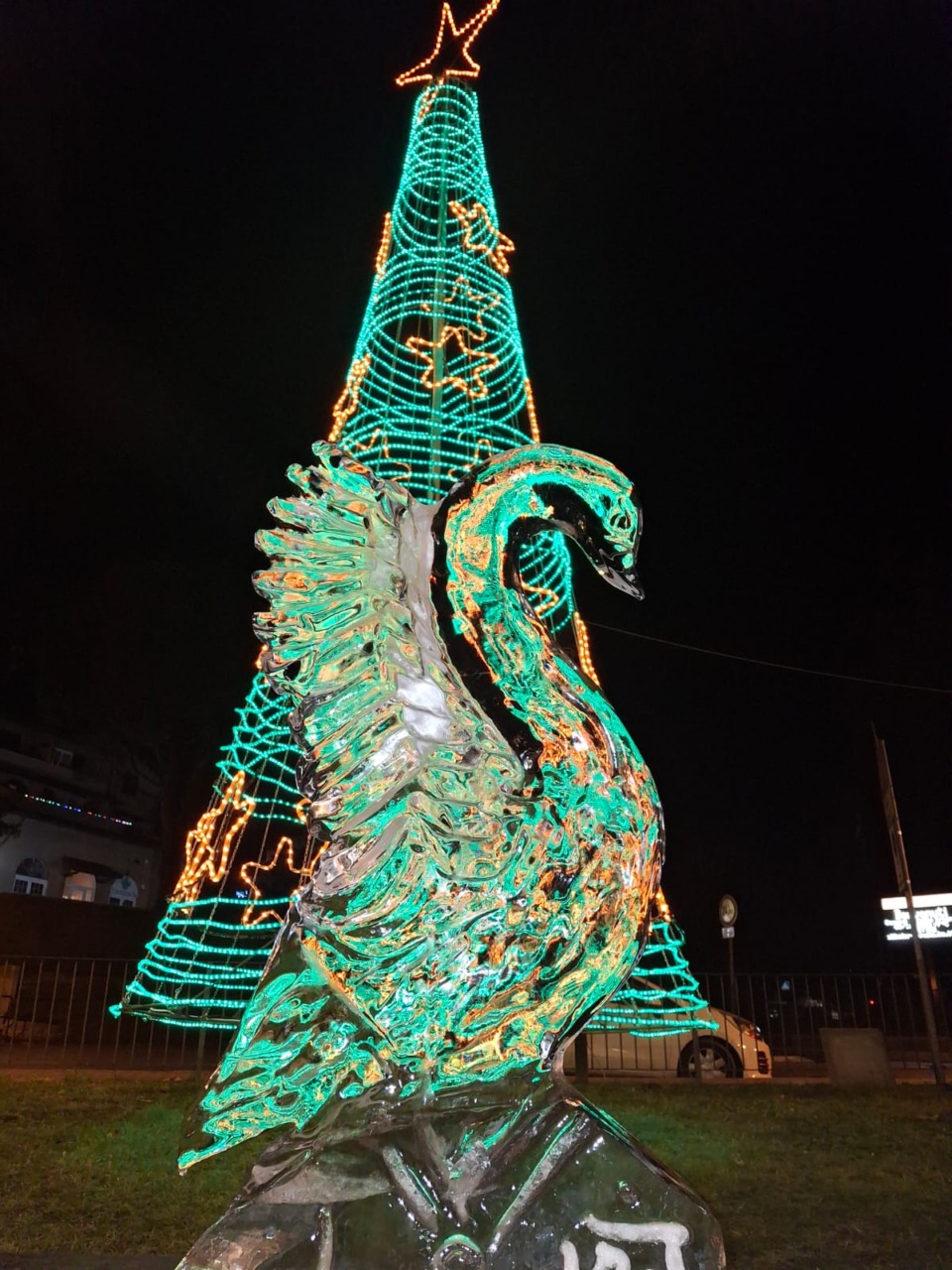 Nel pomeriggio poi si è tenuto un laboratorio di argilla e cera a cura di Giovanni Bernocco, che ha ricevuto un sentito ringraziamento dal sindaco Galbusera. A seguire, una performance live a cura del campione del mondo Francesco Falasoni che, partendo da un blocco di ghiaccio, ha realizzato – dinnanzi allo stupore ed ammirazione di grandi e bambini – una stupenda scultura, un maestoso cigno, ancora più suggestivo se ammirato con il riflesso delle luci dell’albero e degli addobbi luminosi.
