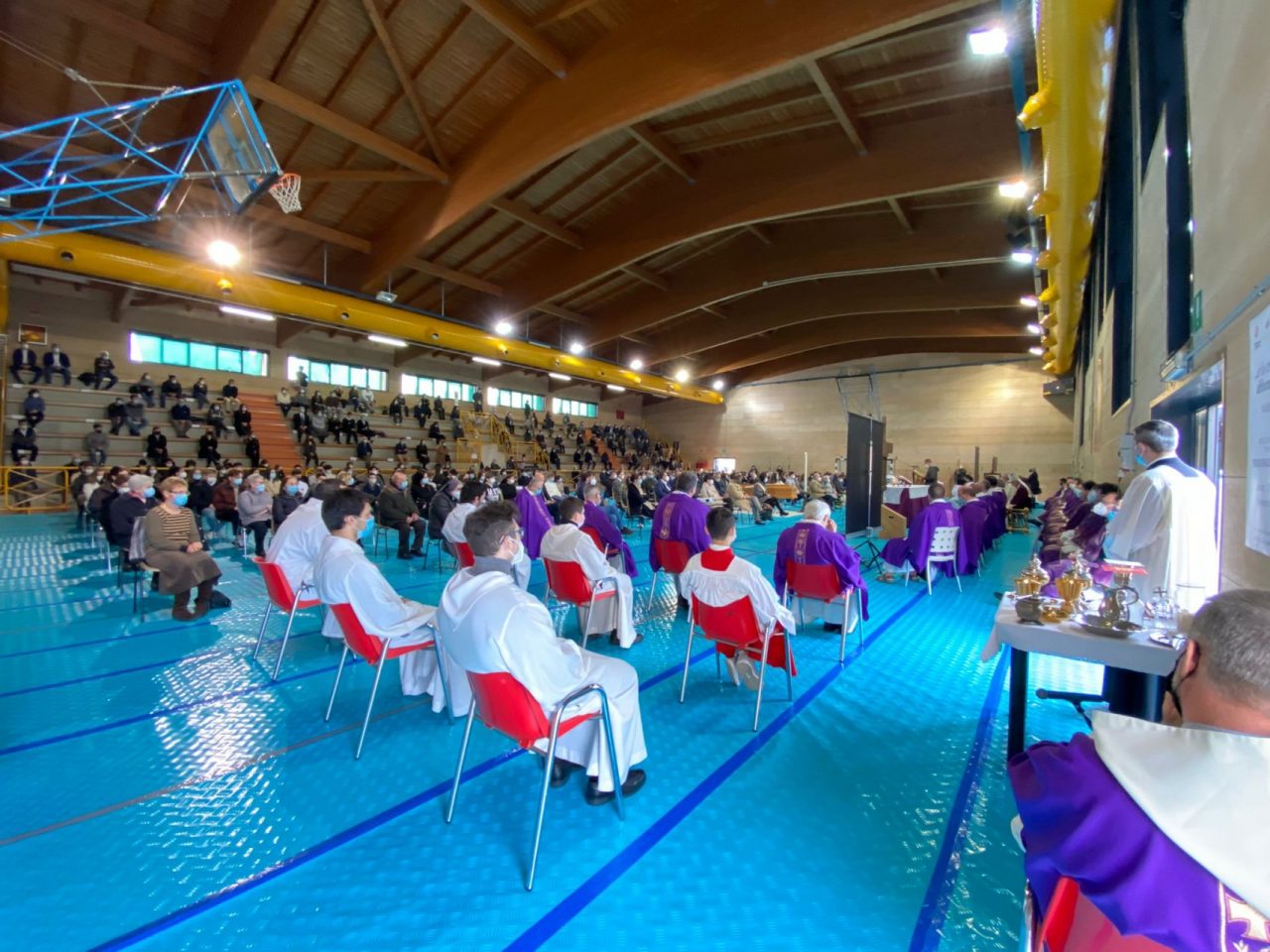Tutto è stato predisposto per la Messa nella palestra di Samber. Inoltre, anche fuori, sono state aggiunte le sedie e attivati gli autoparlanti. La cerimonia, così come il rosario di ieri sera, è visibile anche in streaming su tutti i canali di San Bernardino.
