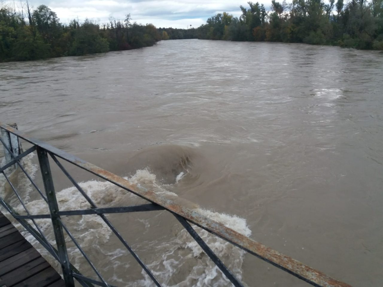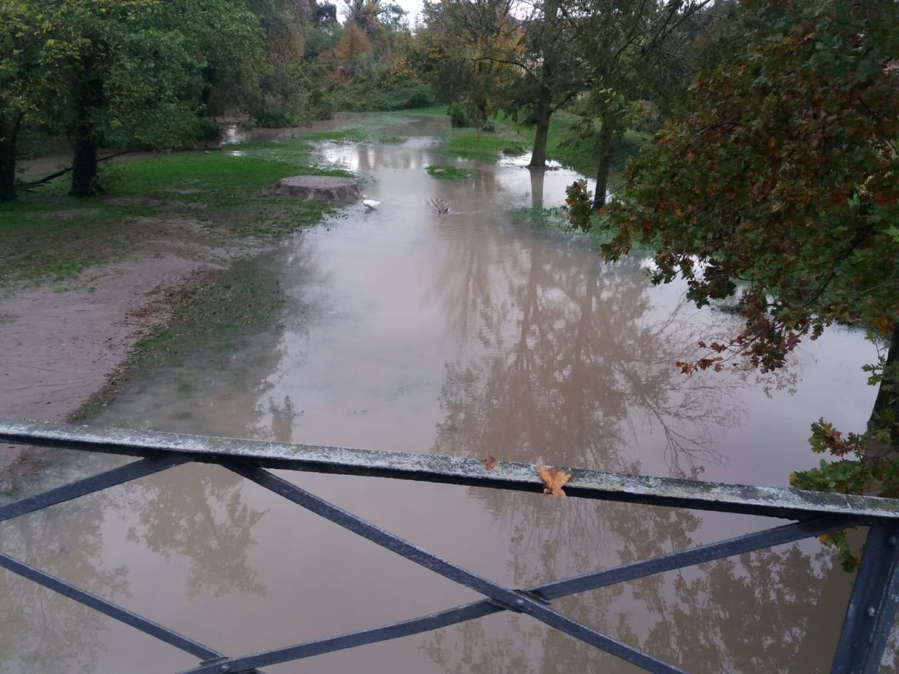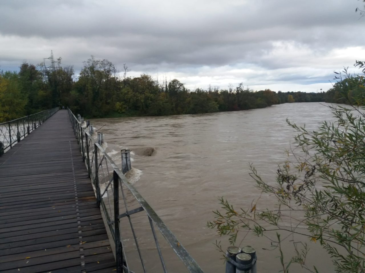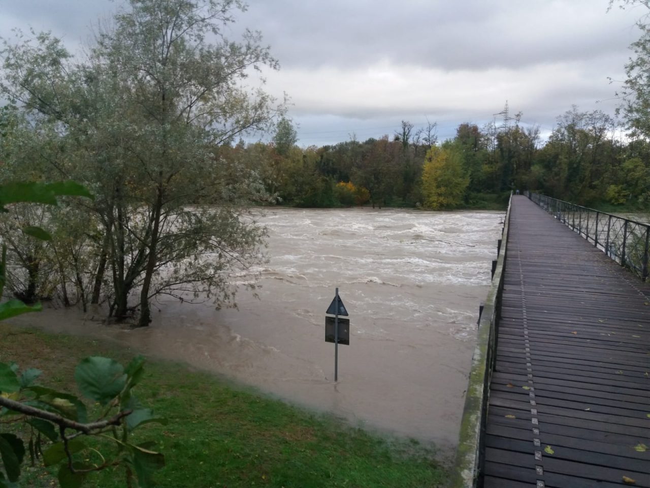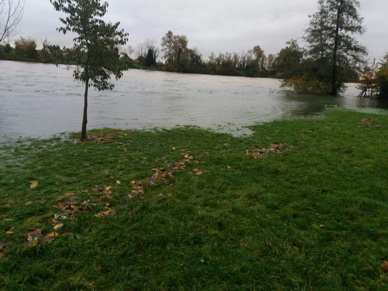 L’Adda in piena esonda nel parco di Fara, in provincia di Bergamo. Allagata l’area giochi, passerella sfiorata dall’acqua. Il picco questa mattina, martedì 27 ottobre, all’alba.