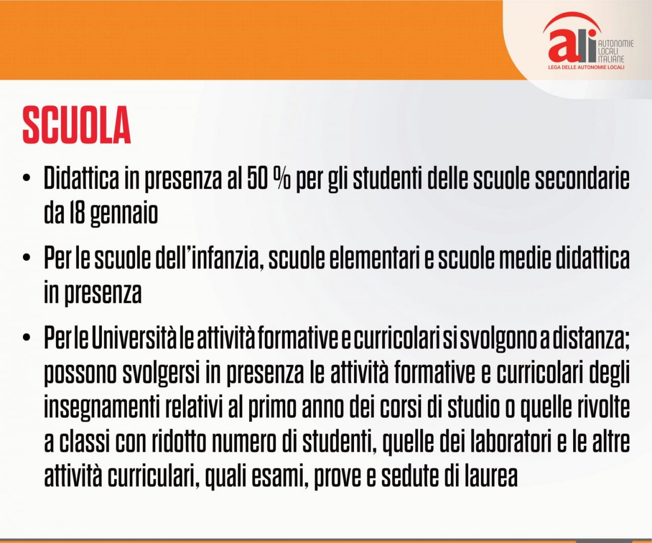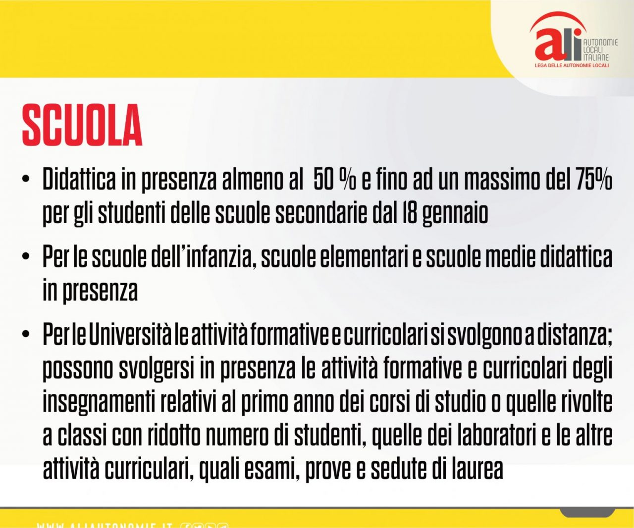 Scuole superiori in presenza almeno al 50% da lunedì 18 gennaio nelle zone arancioni e gialle. Il Dpcm prevede che ogni regione continuerà a poter adottare ordinanze più restrittive. In zona rossa, solo DAD.