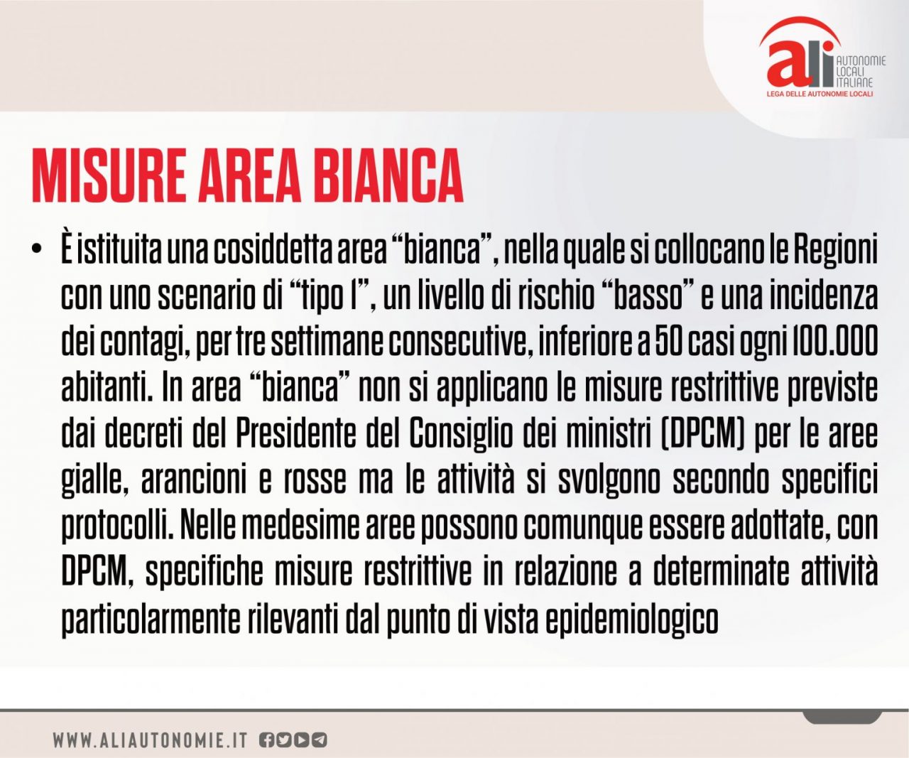 Infine nasce la zona bianca. Per accedere alla zona bianca i parametri sono molto stringenti: scenario di tipo 1 e incidenza dei contagi, per due settimane consecutive, sotto ai 50 ogni 100mila abitanti. Lo scenario di tipo 1 è quello in cui ci sono pochi e tracciabili focolai, con Rt regionali sopra soglia, cioè sopra 1, per periodi limitati, cioè inferiori a 1 mese, e bassa incidenza. In zona bianca dovrebbero riaprire cinema, teatri, musei e anche palestre e piscine. Ma per ora resta un mito.