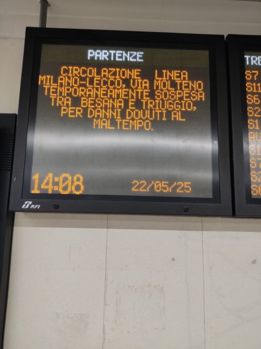 “Circolazione linea Milano-Lecco, via Molteno, temporaneamente sospesa tra Besana e Triuggio per danni dovuti al maltempo” l’annuncio apparso in questi minuti sui tabelloni delle stazioni ferroviarie della tratta del Besanino.