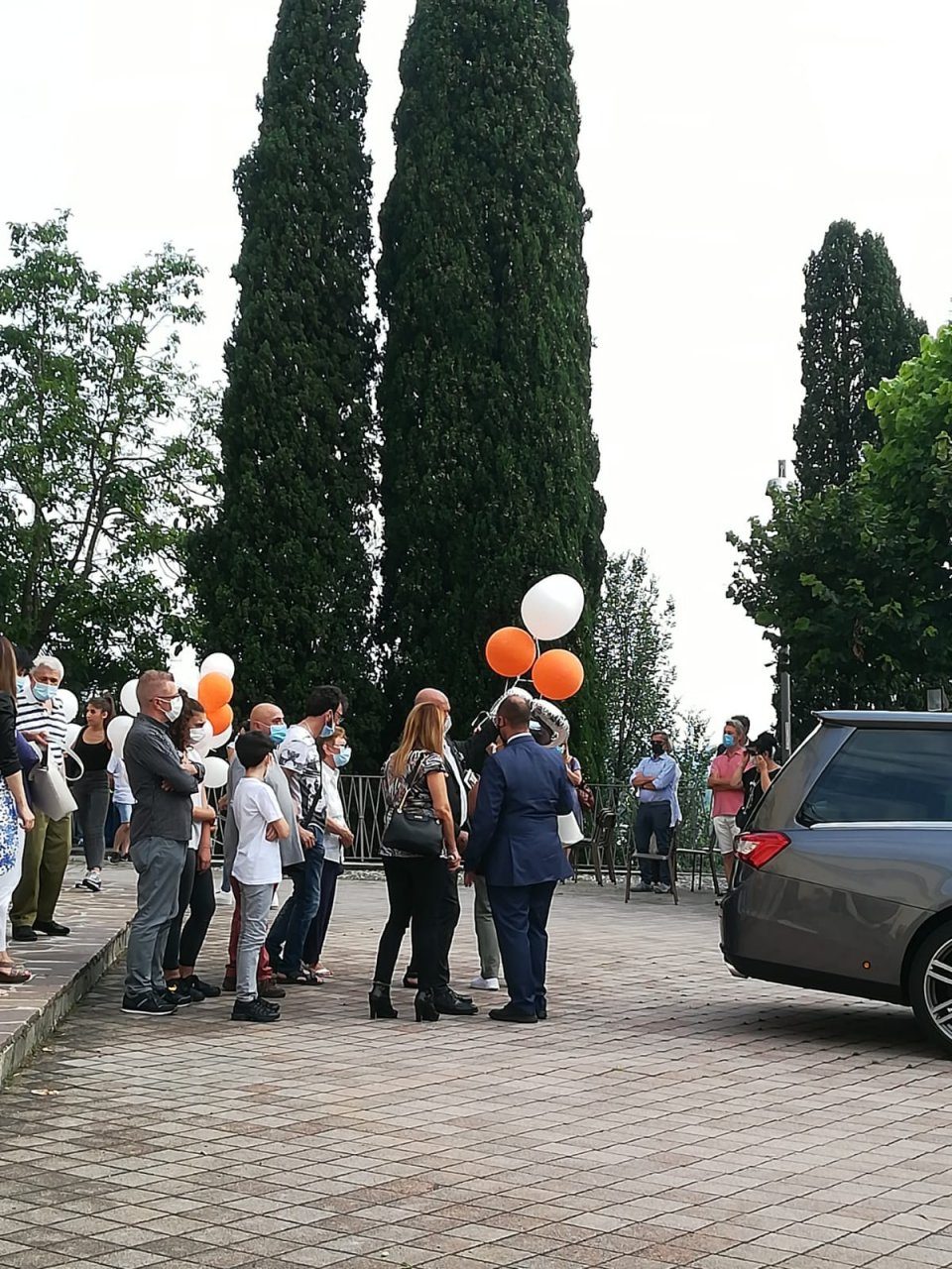 Al termine della funzione, sul sagrato della chiesa, le amiche di Davide hanno lanciato in cielo dei palloncini bianchi e arancio e una lettera D, l’iniziale del suo nome.
