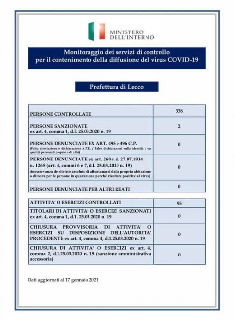 Nell’ultimo giorno di zona arancione solo due multe nel Lecchese. Ieri, sabato 16 gennaio 2021, prima dell’entrata in vigore della zona rossa a Lecco e in Lombardia, sono state infatti solo due le sanzioni per il mancato rispetto delle normative anti Covid elevate dalle forze dell’ordine, coordinate dalla Prefettura di Lecco, nella nostra provincia.