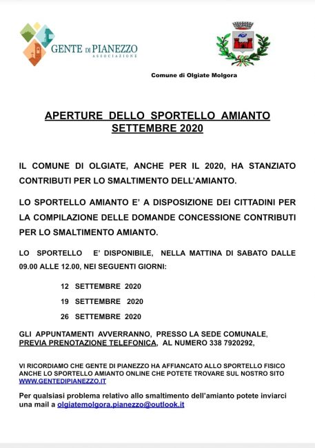Anche quest’anno il Comune di Olgiate Molgora ha stanziato dei fondi per aiutare i privati per lo smaltimento dell’amianto. Tutte le indicazioni in merito sono state riportate sul sito comunale.