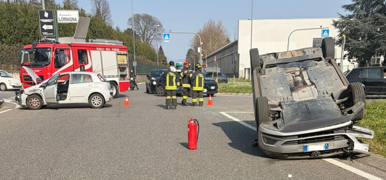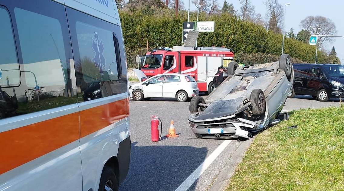 Poco dopo le 14, all’altezza della rotonda del Pino, sul confine tra i Comuni di Lomagna e Carnate, due vetture si sono scontrate violentemente, provocando il ribaltamento di uno dei mezzi coinvolti.