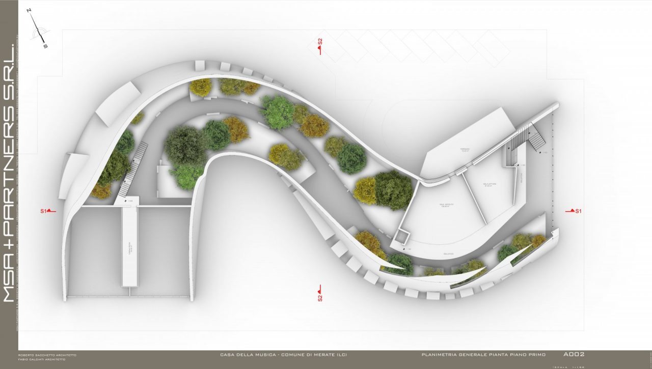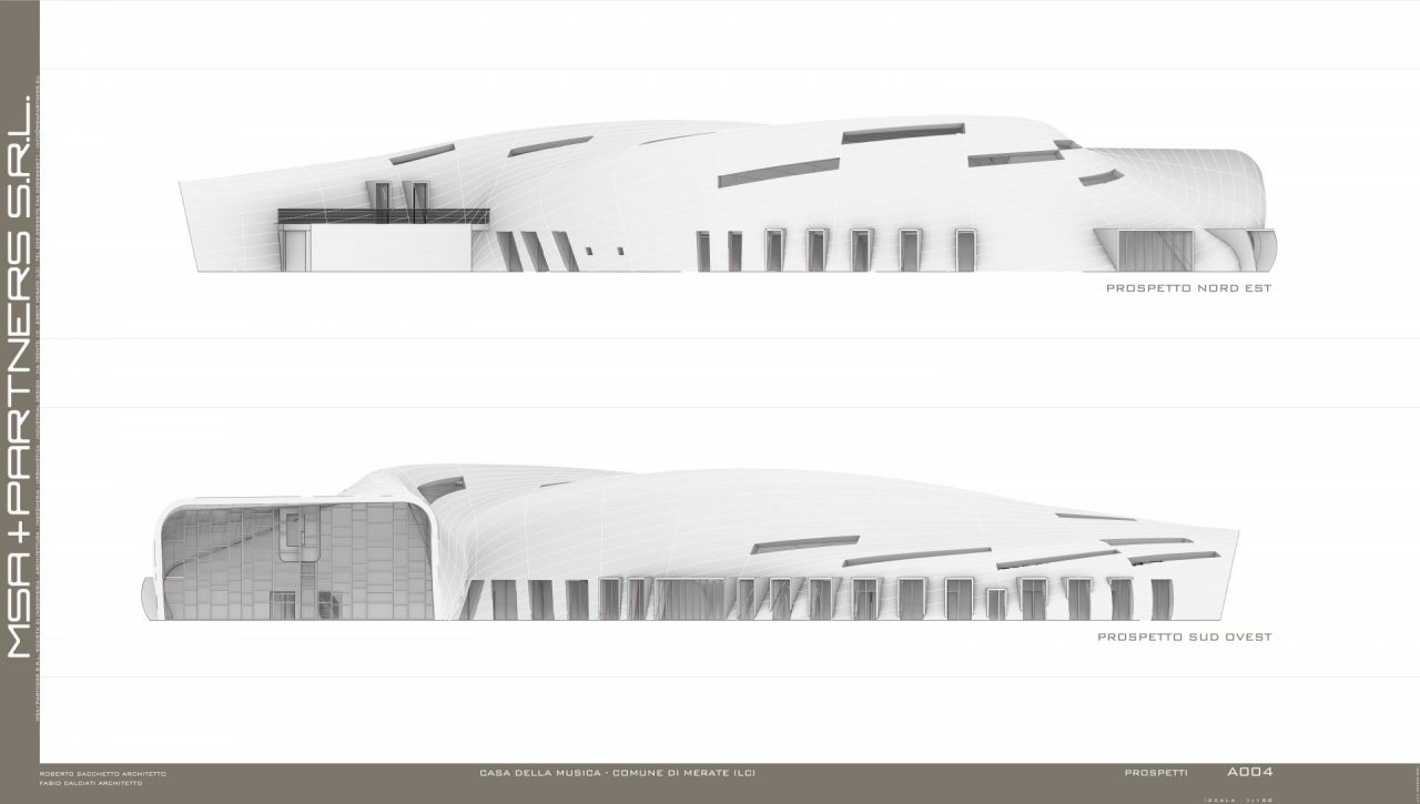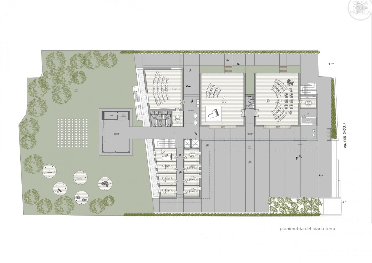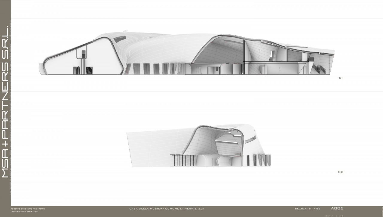 «Nel nostro studio siamo partiti dal concetto di onde sonore, riportandole in tre dimensioni e attraverso le quali poi andare a creare un edificio – ha raccontato il professionista raccontando la genesi del progetto presentato sabato mattina in municipio – Consideriamo che l’edificio confinerebbe con il magazzino di un piccolo centro commerciale, ricavare un parco in quella zona potrebbe non essere la scelta più adatta dal punto di vista estetico: lo spazio verde è stato quindi ricavato nella pancia di questa sinusoide». L’opera avrebbe ospiterebbe, al piano terra ingresso, hall, aule e in fondo due ulteriori grandi aule per la «celebrazione della musica» da parte della banda e della scuola di musica. «Abbiamo inserito all’interno dell’architettura i giardini pensili per includere il verde nell’edificio e poterne godere sia dal corridoio che dalla scala – ha proseguito il professionista – La zona destinata a uso caldaia o servizi è separata e nascosta al pubblico, nelle grandi vetrate verrebbero integrati dei pannelli fotovoltaici per la produzione di energia».