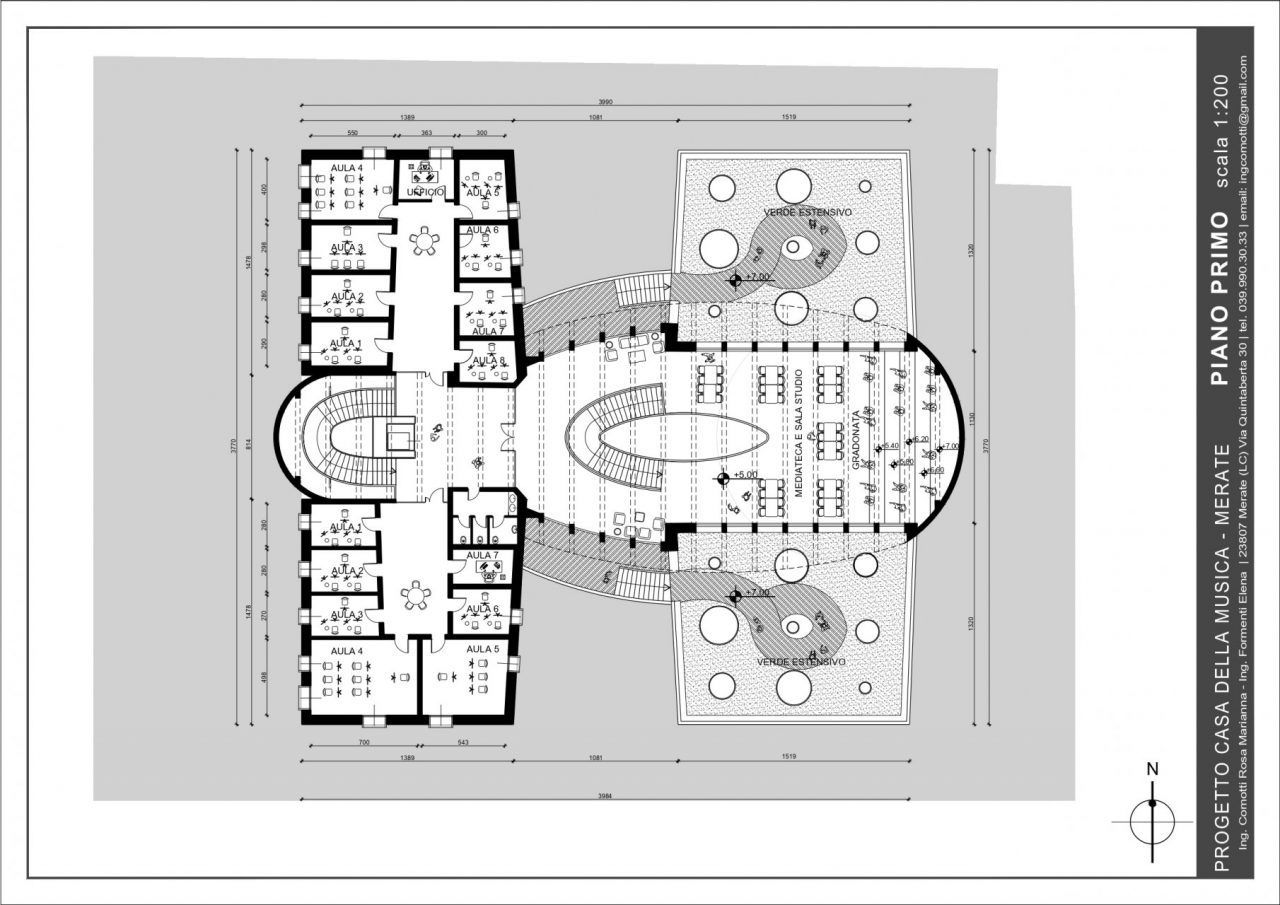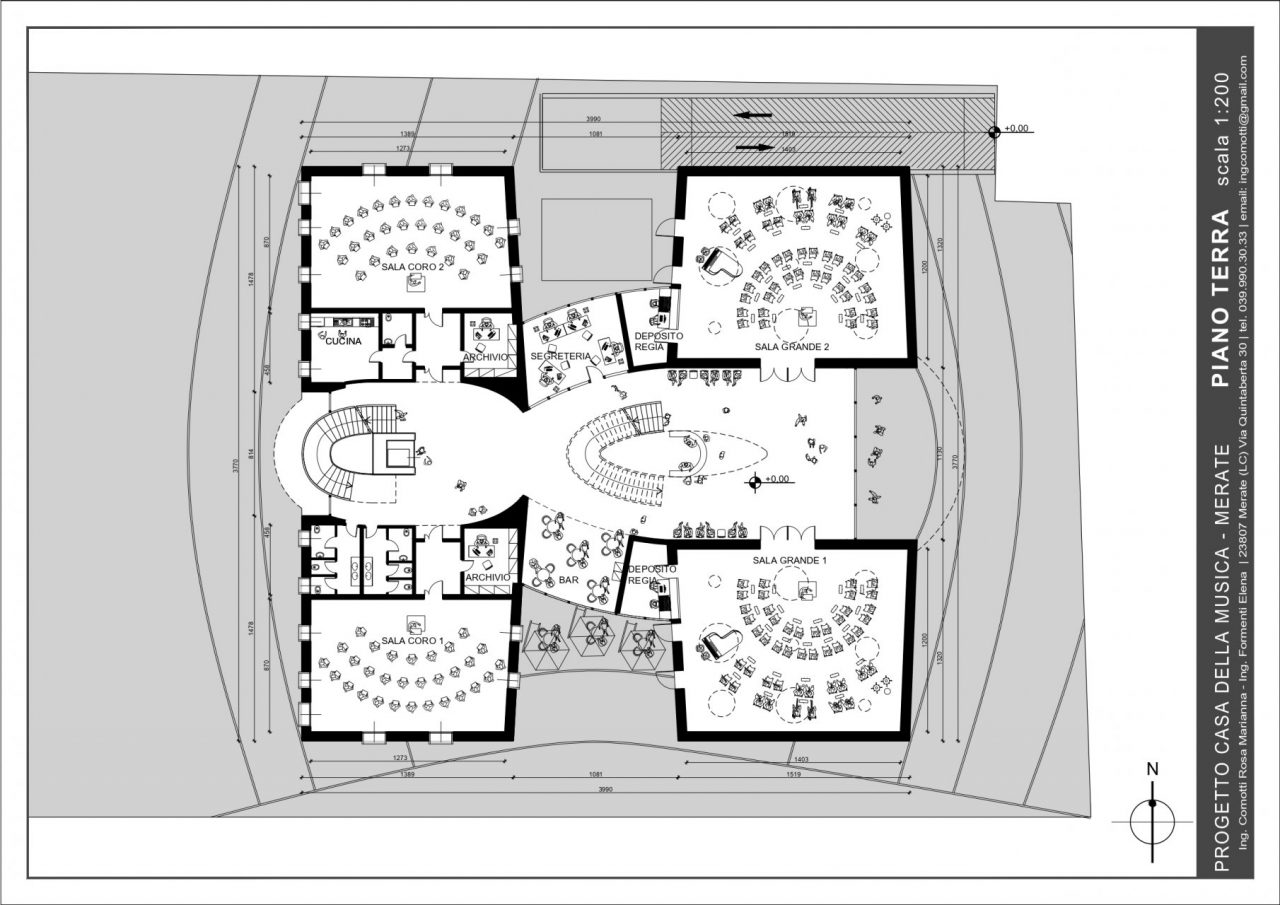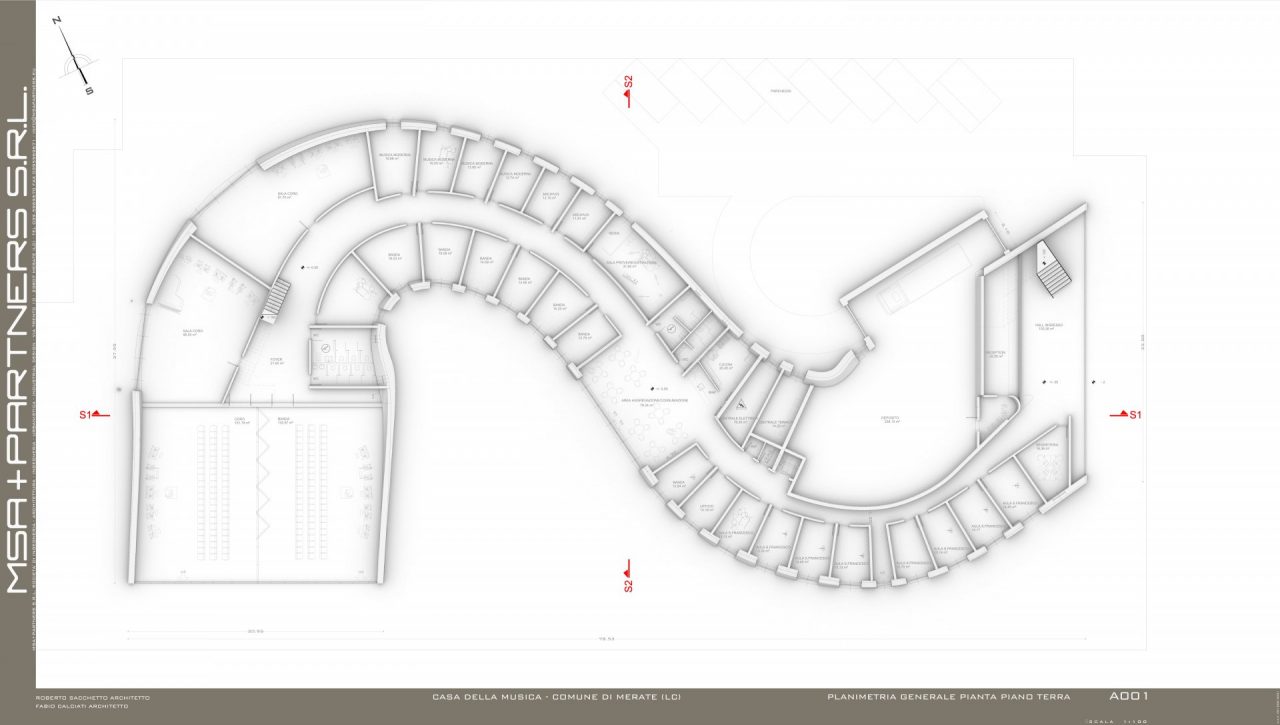 «Nel nostro studio siamo partiti dal concetto di onde sonore, riportandole in tre dimensioni e attraverso le quali poi andare a creare un edificio – ha raccontato il professionista raccontando la genesi del progetto presentato sabato mattina in municipio – Consideriamo che l’edificio confinerebbe con il magazzino di un piccolo centro commerciale, ricavare un parco in quella zona potrebbe non essere la scelta più adatta dal punto di vista estetico: lo spazio verde è stato quindi ricavato nella pancia di questa sinusoide». L’opera avrebbe ospiterebbe, al piano terra ingresso, hall, aule e in fondo due ulteriori grandi aule per la «celebrazione della musica» da parte della banda e della scuola di musica. «Abbiamo inserito all’interno dell’architettura i giardini pensili per includere il verde nell’edificio e poterne godere sia dal corridoio che dalla scala – ha proseguito il professionista – La zona destinata a uso caldaia o servizi è separata e nascosta al pubblico, nelle grandi vetrate verrebbero integrati dei pannelli fotovoltaici per la produzione di energia».