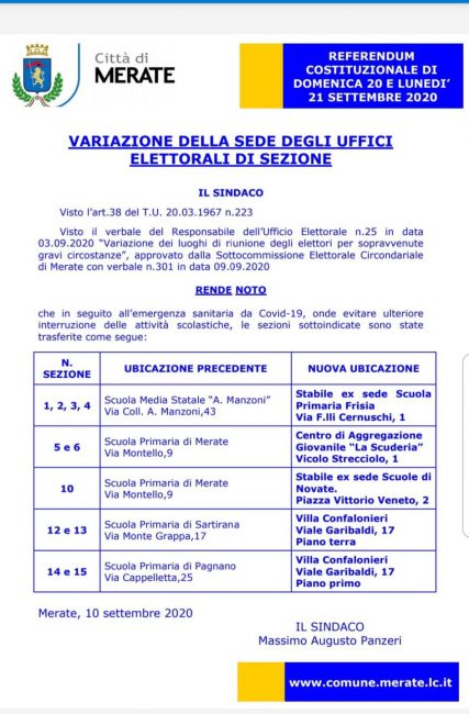 “Si voterà presso Villa Confalonieri, nelle scuderie già sede del centro di aggregazione giovanile in vicolo Strecciolo, presso le ex scuole di Merate via fratelli Cernuschi e di Novate in piazza Vittorio Veneto – si legge nella nota nel Comune – Lo spostamento delle sedi elettorali è stato fortemente voluto dalla nostra amministrazione comunale per evitare un’interruzione della didattica a pochi giorni dalla ripartenza dell’anno scolastico. Si tratta di una grande operazione che consentirà a molti genitori e alle famiglie di non dover gestire i figli nei giorni di chiusura delle scuole per le elezioni. È un risultato importante perché consentirà la continuità dell’anno scolastico appena iniziato. Sarebbe stato pazzesco mandare i figli a scuola un giorno e poi bloccare subito l’attività scolastica per andare a votare”.
