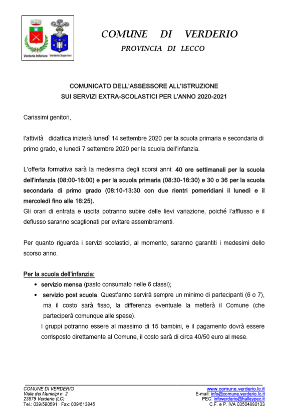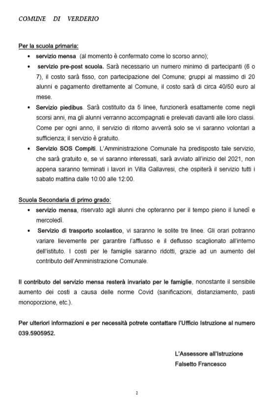 Scuola: l’assessore all’Istruzione Francesco Falsetto informa le famiglie sull’erogazione dei servizi extra-scolastici a Verderio.