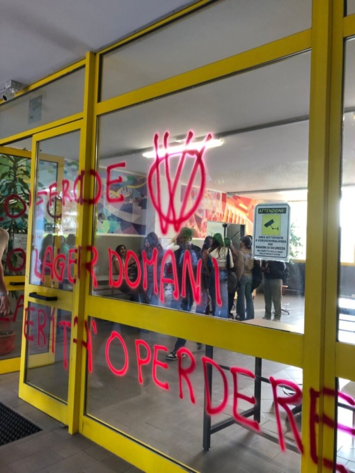 Nella mattina di oggi, martedì 6 giugno 2023, gli studenti del liceo Agnesi, nell’andare a scuola, hanno ritrovato l’ingresso vandalizzato e imbrattato con numerose scritte rosse. Una bravata? Un gesto d’attenzione? ancora non è chiaro la ragione dell’azione tremenda e spetterà alla forze dell’ordine visionare le diverse telecamere e scoprire il colpevole.