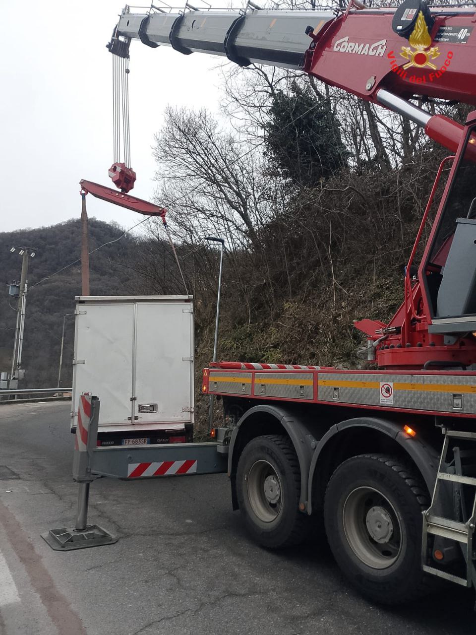 Lungo intervento dei pompieri di Lecco oggi, martedì 23 dicembre 2025 a Torre de’ Busi per un veicolo a rischio ribaltamento.