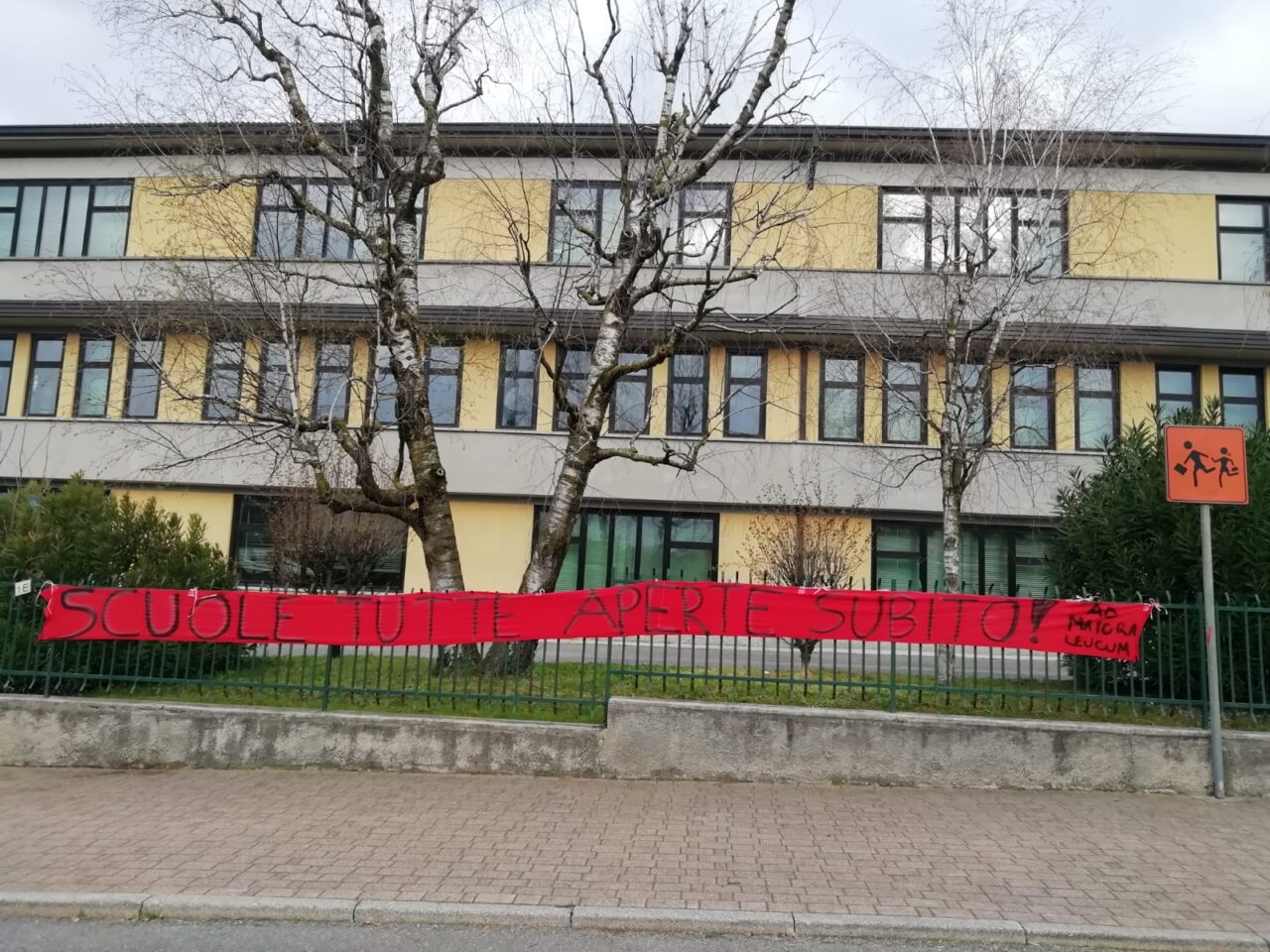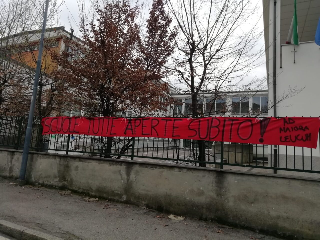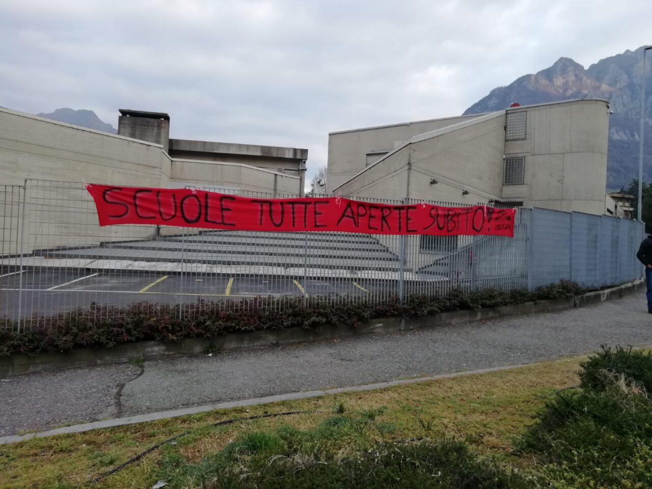 “Scuole tutte aperte subito“, così recitano gli striscioni affissi questa mattina dai militanti dell’associazione Ad Maiora Leucum fuori da due istituti superiori, Bovara e Parini, e da due scuole secondarie di primo grado, Oggiono e Costa Masnaga. Un messaggio chiaro, netto e preciso che vuole contrapporsi ad un anno di confusione, continue promesse mancate e false rassicurazioni.