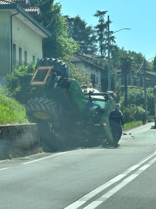 Trattore si ribalta sulla provinciale. E’ successo a Calco, in via Nazionale, nel pomeriggio di oggi, venerdì 2 maggio 2025.