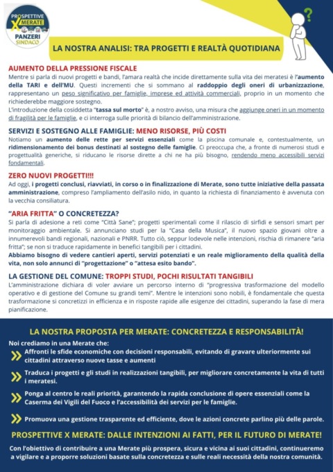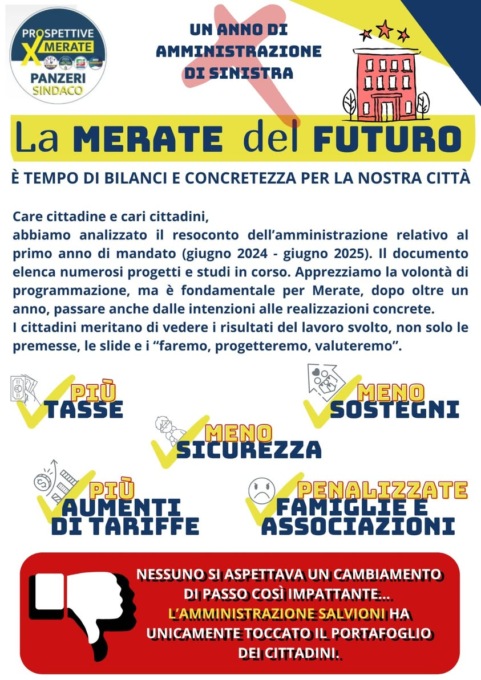 Secondo il gruppo Prospettive per Merate, la città dovrebbero essere in grado di “affrontare le sfide economiche con decisioni responsabili, evitando di gravare ulteriormente sui cittadini attraverso nuove tasse e aumenti; tradurre i progetti e gli studi in realizzazioni tangibili, per migliorare concretamente la vita di tutti; porre al centro le reali priorità, garantendo la rapida conclusione di opere essenziali come la Caserma dei Vigili del Fuoco e l’accessibilità dei servizi per le famiglie e promuovere una gestione trasparente ed efficiente, dove le azioni concrete parlino più delle parole. Con l’obiettivo di contribuire a una Merate più prospera, sicura e vicina ai suoi cittadini, il gruppo di minoranza continuerà a vigilare e a proporre soluzioni basate sulla concretezza e sulle reali necessità della comunità”.
