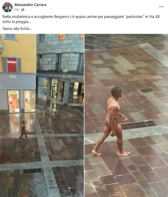 Camminava nudo in piazza XX Settembre, in pieno centro a Bergamo, incurante della pioggia e della grandine.  E’ successo nel pomeriggio di ieri, venerdì 29 agosto 2025, e il giovane di colore protagonista dell’insolita passeggiata è stato immortalato, senza nemmeno nasconderne il volto o le parti intime, e postato sui social network.