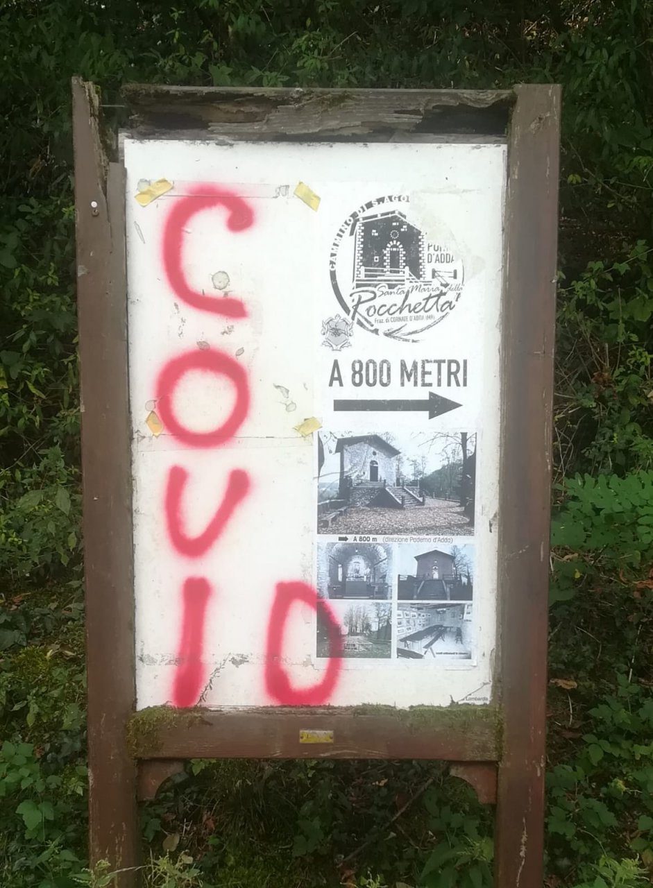 Diverse scritte “Covid” realizzate con la vernice rossa e anche alcune croci sono apparse sulle bacheche informative e, fatto ancor più grave, sui tronchi di alcuni alberi dei boschi a ridosso dell’Adda. Uno tra i primi ad accorgersi di quanto accaduto, probabilmente nella notte o comunque nella serata di ieri, venerdì, è stato Fiorenzo Mandelli, storico custode del santuario della Rocchetta e “guardiano” di quello splendido angolo di Brianza al confine tra i territori di Paderno e Porto d’Adda. Un fatto grave, compiuto per altro in un periodo di semi-lockdown durante il quale gli autori dei vandalismi non avrebbero nemmeno potuto essere da quelle parti se non, eventualmente, per svolgere attività sportive.