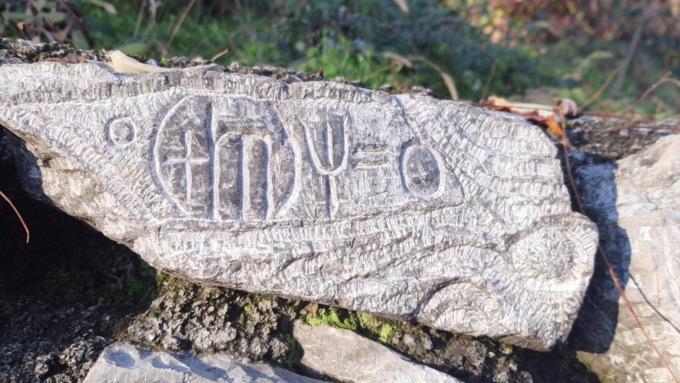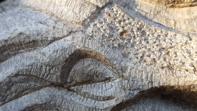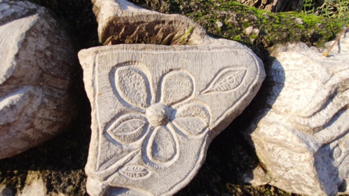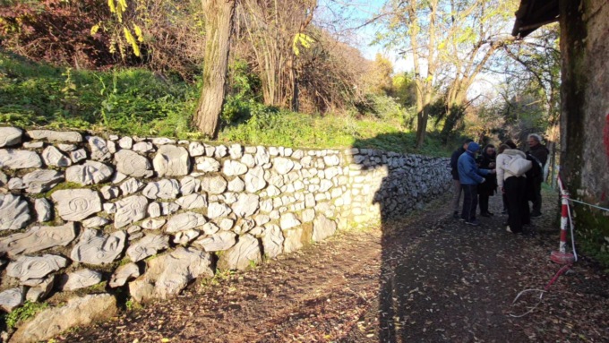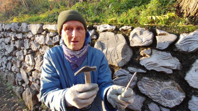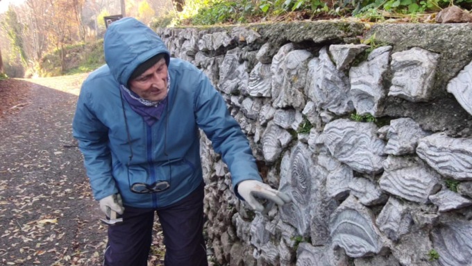 "Lo faccio da tutta la vita..." racconta, mostrando il piccolo martello con cui lavora quasi tutti i giorni, da sei anni, lavorando segno dopo segno le pietre che compongono un lungo muretto che costeggia il "suo" sentiero. È il muretto, ormai,  ad essere diventato esso stesso un'opera d'arte.
